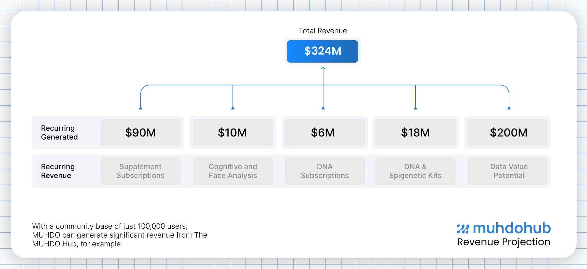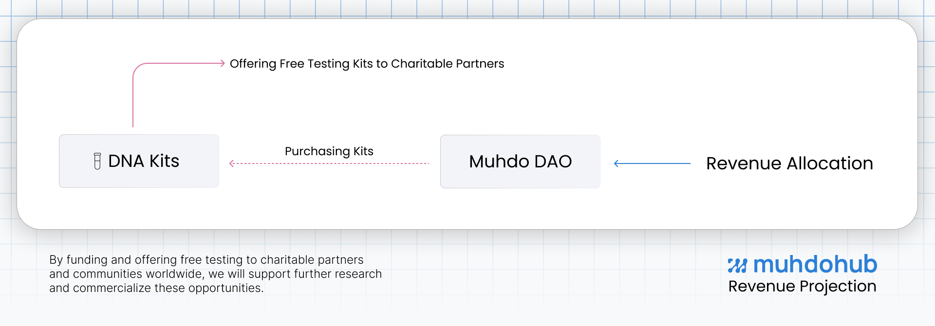 The revenue allocated to the Muhdo DAO will drive continuous customer acquisition and revenue for Muhdoβs Web3 and Web2 ventures. By funding and offering free testing to charitable partners and communities worldwide, we will support further research and commercialize these opportunities. Each epigenetic data point generated will, on average, create huge value for our Web3 community.