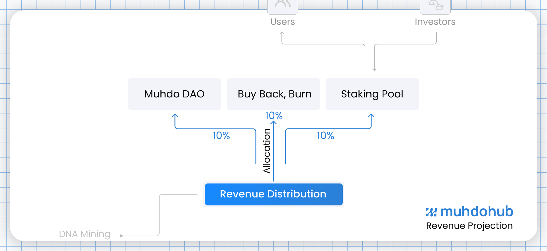 The revenue allocated to the Staking Pool is used to provide rewards to all Muhdo Earn participants who deposit their $DNA tokens to the protocol. These rewards are paid in the $DNA token.