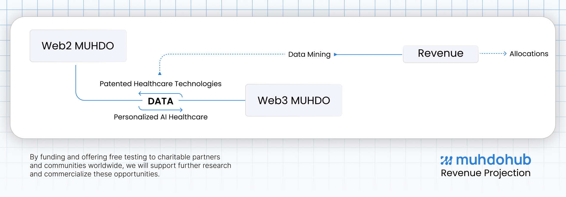 At the user's discretion, this data can be monetized to provide health researchers with relative data to aid in studies to develop innovation in the health sector. This is a lucrative value proposition to generate revenue which in turn is allocated to the Muhdo Web3 sector.